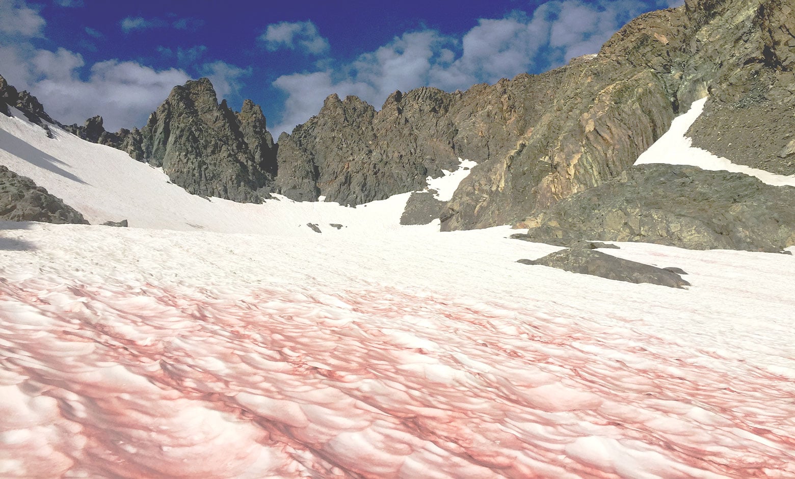 সমুদ্রপৃষ্ঠ থেকে অনেকটা উচ্চতায় এমন বরফের দেখা পাওয়া যায়। যে বরফ সহজে গলে না। জমাট বেঁধে থাকে। সেই বরফ অনেক জায়গায় লাল বা গোলাপি রংয়ের হয়। যাকে অনেকে পিঙ্ক স্নো বলেও ব্যাখ্যা করেন।